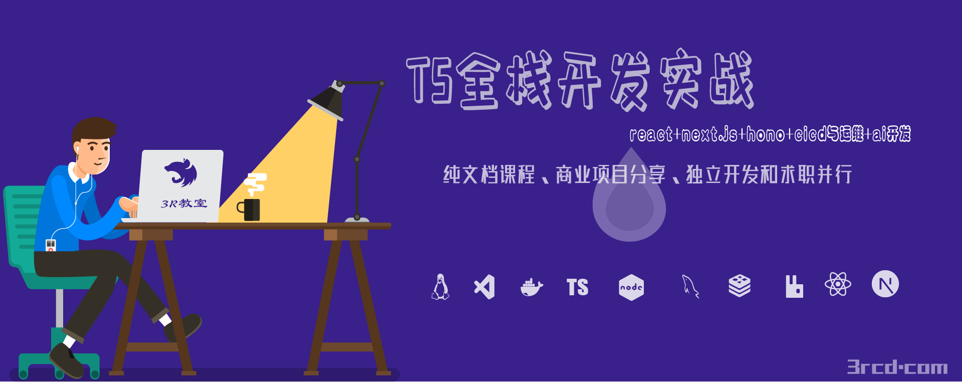因为,首先3R教室一直以来都是以TS教学为主,并且我们的3R工作室开发的几乎所有商业外包项目均使用TS技术栈,方便大家学习源码从而进一步加深理解;其次,随着AI的发展,尤其是vibe coding能力的不断进步,自动化编程越来越受欢迎。而在所有编程语言中,AI对TS/JS的支持力度无疑是最佳的。无论是各种AI开发工具(如cursor、antigravity、claude code、codex等)对编写TS代码的支持,还是TS本身去开发AI所使用到的绝大部分Agent工具(如langchain、n8n、vercel ai等),TS永远是和Python一个档位头等公民。而Python更适合AI底层方向的开发,对于大模型api的调用和智能体的开发,TS因为其全栈的可行性,明显是更具优势的。最后,也是最重要的,TS全栈开发在变现方面是最佳的技术栈。在求职方面:无论是海外工作、远程工作、国内外企等岗位几乎是占据了巨大多数份额;而剥离其后端开发的node.js技能,纯粹的react、vue等前端技能以及rn、electron等客户端开发技能,在国内传统的大中小厂中也基本上是唯一选择。在个人或小规模创业方面:TS由于其前后端使用一种统一的编程语言以及成熟的生态,再加上AI头等公民的支持,使其能快速的开发出一些你想到的东西。也因为其部署成本的低廉(serverless等支持),成为远程个人和小团队快速上线MVP产品的首选!以上正好契合了3R教室的"远程自由之职业"的理念,使技术课与变现课无缝衔接,相互作用。为此,我们选择了TS全栈作为3R教室的主力课程